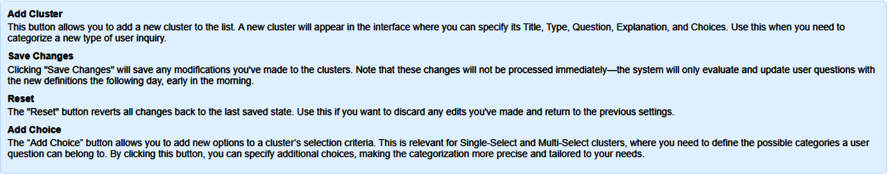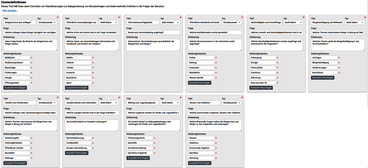 Mit diesem Button können Sie einen neuen Cluster zur Liste hinzufügen. Der neue Cluster erscheint dann in der Oberfläche, wo Sie Titel, Typ, Frage, Erklärung und Unterpunkte (Choices) festlegen können. Nutzen Sie diese Funktion, wenn Sie eine neue Art von Nutzeranfragen kategorisieren möchten.