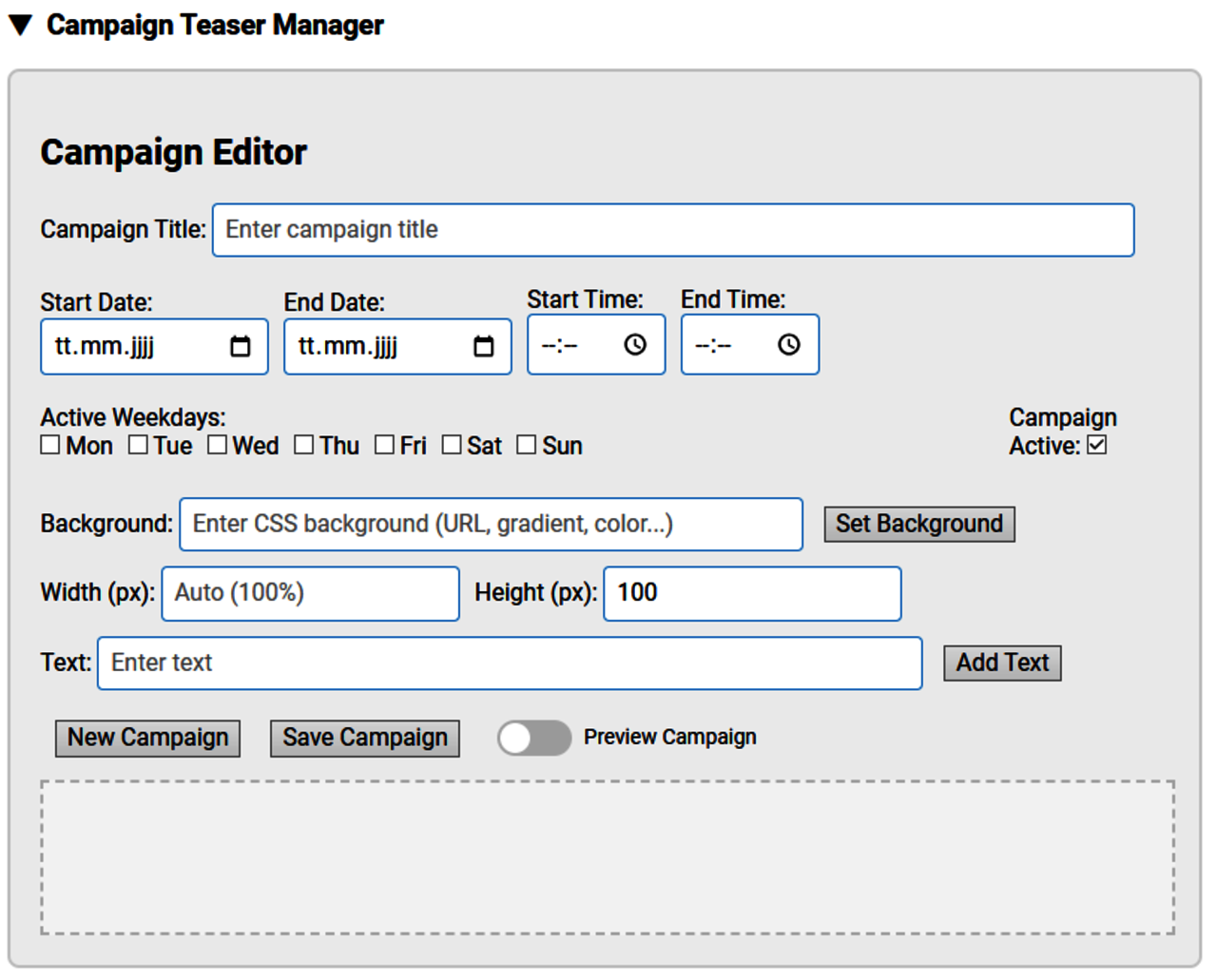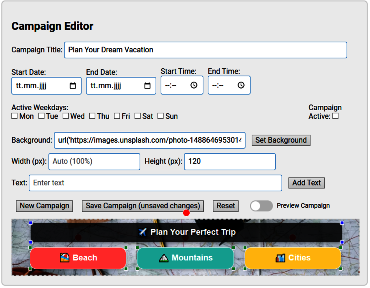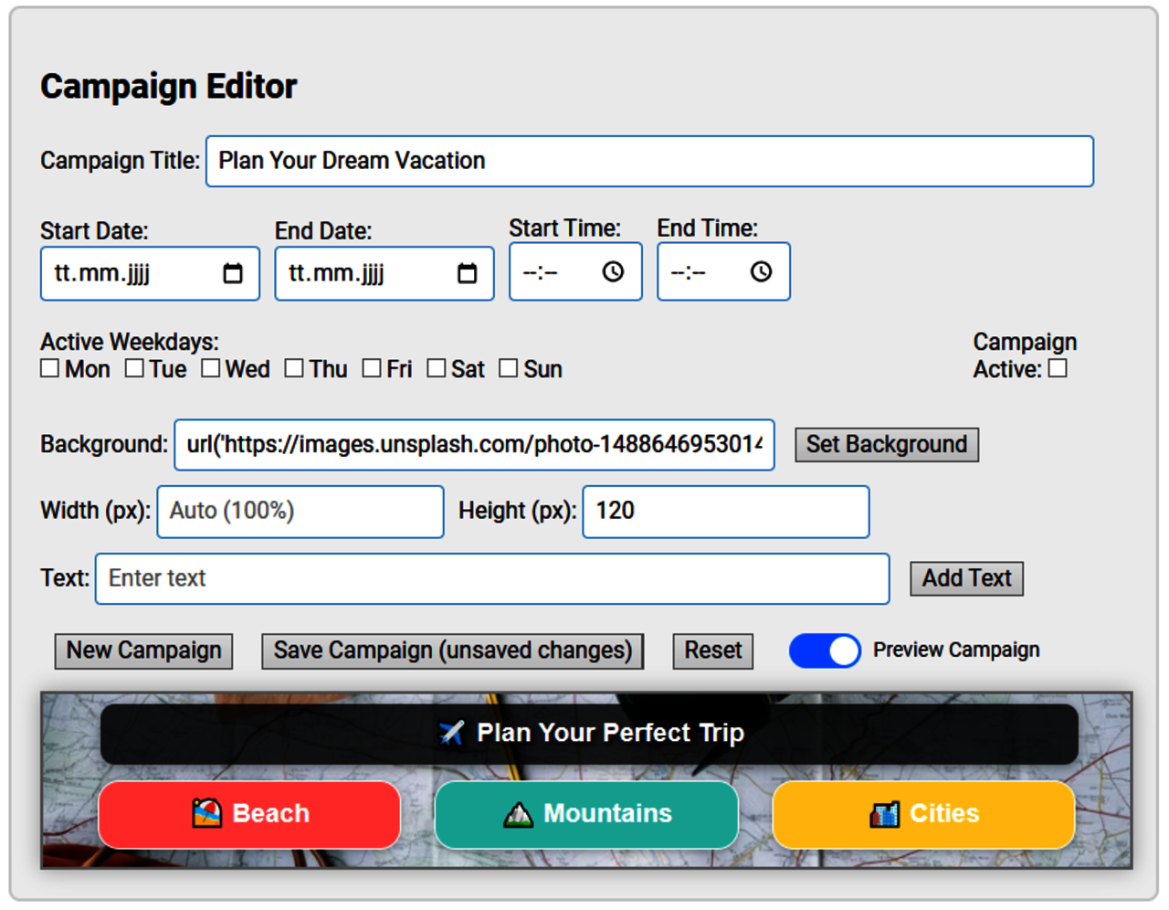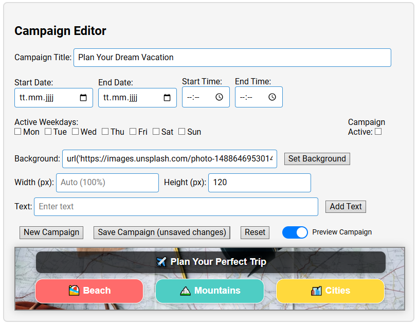 - Wichtig ist anzumerken es können nur Veränderungen am Banner vorgenommen werden wenn der Schalter “Preview Campaign” auf aus ist. Sobald aktiviert können keine Änderungen gemacht werden.