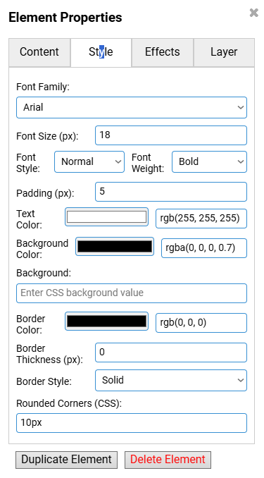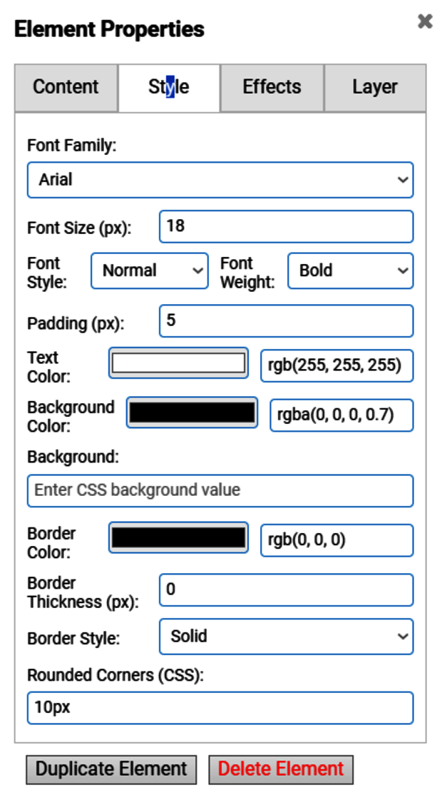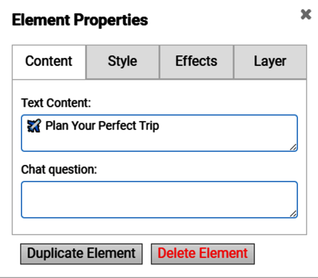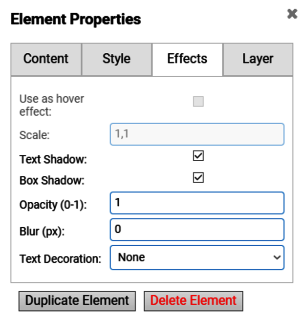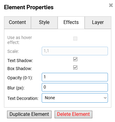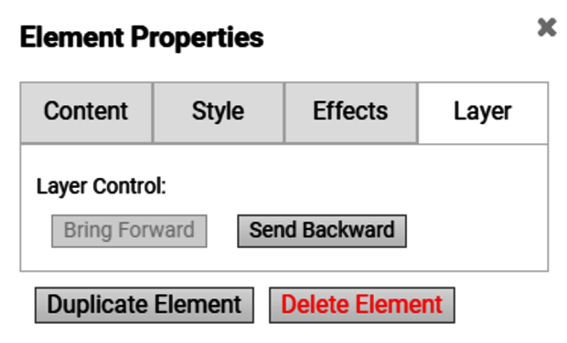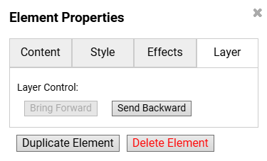 Unter jeden Reiter der “Element Properties”, “Content”, “Layer”… steht ganz unten noch die Optionen “Duplicate Element”, für das duplizieren/kopieren und einfügen des gleichen Elements und “Delete Element” für das logische Löschen eines Elements.